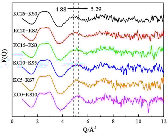 It can be seen from Figure 3 that with the decrease of KCl mass fraction and the increase of K2SO4 mass fraction in the mixed solution, a flat-topped peak appeared near Q = 2.5 Å−1, which gradually split into two peaks, and the double peaks became more and more obvious. The peak appearing at this position is the structural characteristic peak of the aqueous solution, which is related to the hydrogen bond network structure in the water [22]. The peak near Q = 5 Å−1, which is very sensitive to the degree of hydrogen bond destruction in the solution [23], tended to move to the right of abscissa. Study of the structure of a single potassium salt aqueous solution shows that the law of peak movement in the mixed aqueous solution is the result of the superposition of two potassium salts, but the effect of KCl is stronger.