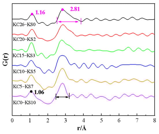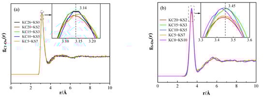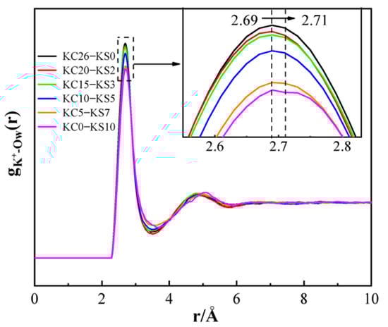 Figure 10 is a PDF diagram of K-OW with various concentrations of KCl and K2SO4 in mixed aqueous solutions. Figure 10 demonstrates that the first peak of the K+-OW PDF was at 2.7 Å. Combining the positions of the first peaks in Figure 8a and Figure 9a, it was proven that the earlier G(r) analysis hypotheses, that the peak near 2.8 Å resulted from the interaction of K+-Cl−, K+-OW, and OW-OW, were accurate.
