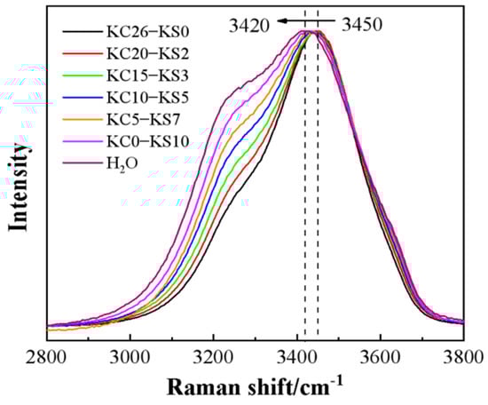 It can be seen from Figure 5 that, with the decrease of KCl and the increase of K2SO4 in the mixed aqueous solution, the shoulder peaks appearing in the range of 3200–3300 cm−1 showed an expanding trend; the overall peak shape of the scanning range gradually broadened. At the same time, the characteristic peak shifted significantly, from 3450 cm−1 to 3424 cm−1. Through the study of the structure of a single potassium salt solution, it can be proven that these changes are consistent with the laws presented in a single potassium salt aqueous solution [24].