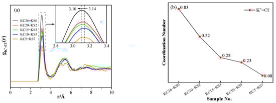 Figure 8 depicts the PDF and coordination number diagrams for K+-Cl− in mixed aqueous solutions containing varying concentrations of KCl and K2SO4. It can be seen from Figure 8a that the first peak was relatively strong, indicating the short-range order of the ion arrangement in the aqueous solution. As can be seen from the changes in PDF and the coordination number in Figure 8, as the mass fraction of KCl in the mixed aqueous solution increased, the first peak in (a) moved to a smaller distance from 3.14 Å to 3.10 Å; (b) the coordination number between K+-Cl− increased, from 0.08 to 0.83, indicating an enhanced interaction between K+-Cl−. This conclusion confirms that in the G(r) function, the broadening of the peak at the 2.81 Å position toward the high r direction was caused by the K+-Cl− interaction.