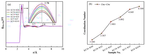 Figure 9 depicts the PDF and coordination number plots of OW-OW in mixed aqueous solutions of KCl and K2SO4 with different concentrations. It can be seen from Figure 9 that the radial distribution function and coordination number of OW-OW in different concentrations of KCl-K2SO4 aqueous solutions showed regular changes. It can be seen from Figure 9b that, the higher the KCl concentration, the lower the coordination number, ranging from 4.10 to 3.44, indicating that the OW-OW interaction in water was gradually weakened, and the tetrahedral hydrogen-bonded water network was severely damaged. This is consistent with the Raman conclusion that KCl damages the hydrogen bond structure of DDAA more severely than K2SO4.