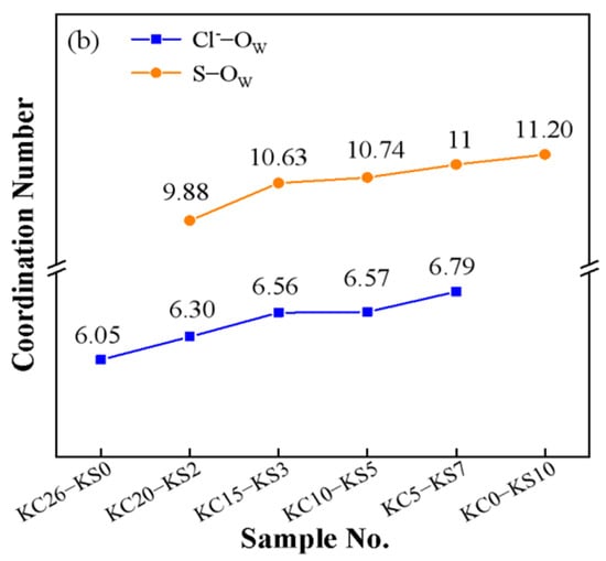 Figure 12 is a diagram of the coordination numbers of Cl−-OW (blue) and S-OW (red) in mixed aqueous solutions. It can be seen from the figure that the coordination number of Cl−-OW was smaller than that of S-OW. Combining the PDF diagrams of Cl−-OW and S-OW, it was found that the hydration radius and coordination number of SO42- in the mixed solution components was larger than that of Cl−, thus revealing the reason why the solubility of KCl in water was greater than that of K2SO4.