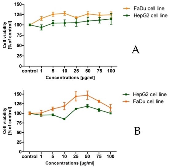 FaDu and HepG2 cell lines were obtained from American Type Culture Collection (Manassas, VA, USA) and cultured using EMEM (Sigma Aldrich, Saint Louis, MO, USA) supplemented with 10% fetal bovine serum (Sigma Aldrich, Saint Louis, MO, USA), 100 U/mL of penicillin and 100 mg/mL of streptomycin (PenStrep, Sigma Aldrich, Saint Louis, MO, USA). Cell lines were incubated at 37 °C in a humidified atmosphere of 5% CO2. Cytotoxic effects of tested extracts and reference substances were examined using MTT assay (Sigma Aldrich, Saint Louis, MO, USA) [] according to the manufacturer’s procedure. Stock solutions of the tested compounds were prepared dissolving in a sterile DMSO. The suspension of cells was prepared at a density of 1 × 105 cells/mL. Cells were incubated for the next 24 h with different concentrations of the tested compounds (1–100 μg/mL). The absorbance was measured at 570 nm using a microplate reader (Epoch, BioTek Instruments, Santa Clara, CA, USA). Each experiment was repeated three times. Results are shown as % of controls cells.