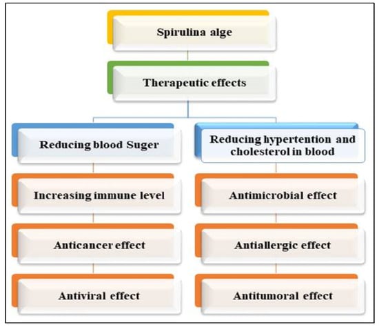 Spirulina, especially A. platensis, has a high nutritional value, does not harm the environment, and possesses remarkable curative capabilities. According to studies, spirulina plays a role in the treatment of a number of diseases, and it can be utilized in the reduction of blood sugar levels, the reduction of blood pressure, the modification of dysbiosis caused by an unbalanced intestinal flora, anticancer, antioxidant, antibacterial, anti-allergic, antiaging, and anti-inflammatory activities, as well as in the reduction of HIV immunity []. The chemical composition of spirulina, which includes minerals (especially Fe), phenols, phycocyanin, and polysaccharides, is primarily responsible for its beneficial effects on human health. The clinical data that are now available do not show that ingesting spirulina poses a threat to one’s health, as stated by the US Food Supplements Convention []. The World Health Organization (WHO) verified that not only is spirulina a good diet due to its high Fe and protein content, but it may also be given to children without any adverse effects []. Figure 2 demonstrates the biological as well as therapeutic benefits of the spirulina algae. In addition to that, it has been described in further detail in Table 4.