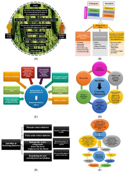 It has been demonstrated that spirulina is both biologically and economically significant due to the numerous applications that have been developed for it in the food, pharmaceutical, biofuel, cosmetics, and agricultural industries. These algae are readily accessible for purchase and have a significant geographic distribution. This is because the manufacturers want to obtain the biomass of spirulina in order to make use of its important biologically active compounds, such as phycocyanins, phenols, polysaccharides, polyunsaturated fatty acids (PUFAs), carotenoids, vitamins, and sterols. This is why there is such a high demand for spirulina. The majority of these compounds play an important therapeutic role in the treatment of cardiovascular diseases (CVDs), high cholesterol, high blood sugar, obesity, high blood pressure, tumors, and inflammatory diseases. In addition to bolstering the immune system, the presence of these compounds is associated with a reduced risk of developing neurodegenerative conditions, such as Parkinson’s disease, Alzheimer’s disease, and multiple sclerosis, in particular. Spirulina is regarded as a natural medicine and is utilized in the manufacturing of functional foods and nutritional supplements all over the world due to the qualities that have been described [,].