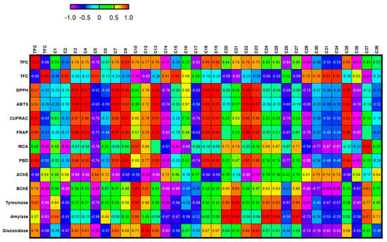 Relationship between secondary metabolites and biological activities of the tested extracts. For compound numbers refer to Table 1. The correlation is considered positive and statistically significant (r > 0.7).