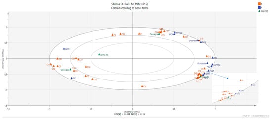 In order to establish a connection between the chemical components and biological effects of the tested extracts, we performed a multivariate statistical analysis. Recently, multivariate statistical approaches have gained interest to identify relationships between different parameters. This gives a good insight into the structure–activity relationship in phytochemical studies. To this end, we first performed a Pearson’s correlation analysis between bioactive components (as total and individually) and biological properties. As can be seen in Figure 1, the total phenolic content was highly correlated with the radical scavenger assay, reducing power assay, and three enzyme inhibition assays (BChE, tyrosinase, and glucosidase). In particular, based on the existence of a strong correlation between the radical scavenger and reducing power assays, we concluded that the same components might play a key role in the assays. This fact was also confirmed by the correlation values between individual phenolics (especially C7 (epicatechin), C9 (caffeic acid), C13 (procyanidin A2), C18 (isoquercitrin), and C19 (delphindin 3,5 diglucoside)) and these parameters. Consistent with our results, several researchers reported that there is a positive correlation between these parameters [50,51,52]. Concerning enzyme inhibitory assays, different results were observed. For example, for AChE, C5 (chlorogenic acid) might be the main contributor with a high correlation value (R > 0.8). As for BChE, C10 (vanillic acid) and C12 (syringic acid) were the main contributors. In addition, the observed tyrosinase inhibitory effect can be attributed to the presence of C10 and C21 (naringin). PLS-DA makes it possible to assess the relationship between the tested parameters and species. The tested plants were separated based on genus and two groups were observed (Figure 2). In general, the Cassia species were characterized by stronger antioxidant properties and a higher content of phenols. However, the Senna species were close and characterized by high flavonoid content, and they were richer in rutin, quercetin, and isorhamnetin.