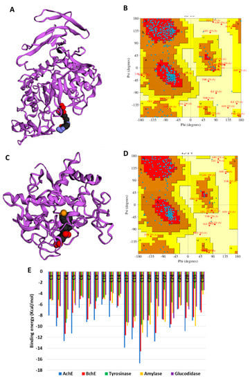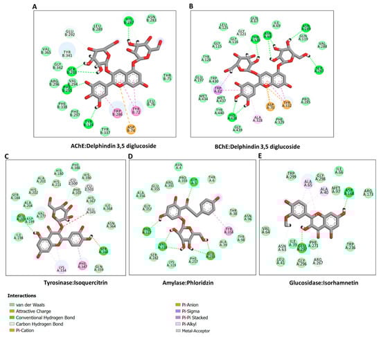 Protein–ligand interactions: (A) ChE:delphindin 3,5 diglucoside; (B) BChE:delphindin 3,5 diglucoside; (C) tyrosinase: isoquercitrin; (D) amylase: phloridzin; and (E) glucosidase:isorhamnetin.