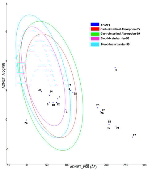 Furthermore, the ADMET properties of the bioactive compounds were predicted using the Biovia DS ADMET prediction toolkit. The four ellipses enclose the area where well-absorbed compounds should be found: at 95 and 99% confidence levels for gastrointestinal absorption (red and green), and for the blood–brain barrier penetration (magenta and aqua). The compounds are shown according to their serial number (Figure 5). Compounds with low molecular weight and low polarity were found to be in one or more ellipses, suggesting low absorption and low blood–brain barrier penetration probability, whereas those with high molecular weight and high polarity were found to be located outside the ellipses, suggesting low absorption and low blood–brain barrier penetration probability.
