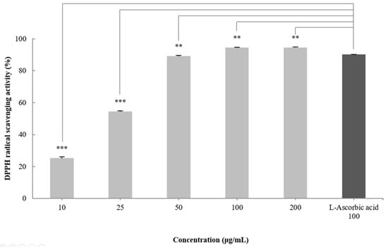 DPPH radical scavenging activity was measured using the Blois method [], with modifications. Different concentrations of the extract and ascorbic acid (positive control) were added to 0.2 mM DPPH solution. Thereafter, the solution was mixed and incubated for 30 min at room temperature in the dark. The absorbance was measured at 515 nm using a Microplate Spectrophotometer (Multiskan Sky; Thermo Fisher Scientific, Waltham, MA, USA). The DPPH radical scavenging rate was calculated using the following formula (Equation (1)):