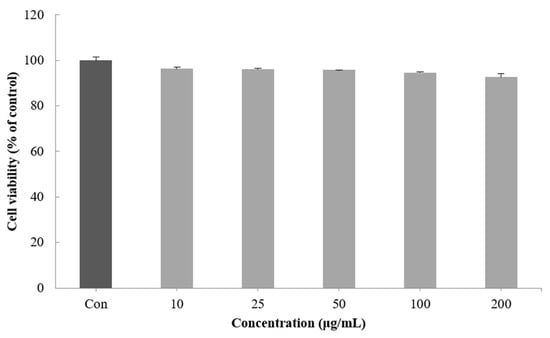 Cell viability was measured by a method using the ability of mitochondria to infiltrate the yellow water solubility substrate MTT tetrazolium into cells by the dehydrogenase action and reduce it from mitochondria to nonreceptivity MTT formazan []. When the viability of the B16F10 melanoma cells treated with 10–200 μg/mL of the CGCS extract was measured, no significant cytotoxicity was found. Therefore, subsequent experiments were performed with a concentration of 200 µg/mL or less (Figure 2).
