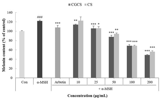 Melanin is a dark brown or black pigment produced in an organelle called melanosomes in melanocytes. Skin color is determined by the amount of melanin and darkens as the amount of melanin increases []. To confirm the effect of the CGCS extract on melanogenesis, the melanin content in B16F10 melanoma cells was measured following treatment with α-MSH, CGCS extract, CS extract, and arbutin (the positive control). Compared with the α-MSH treatment group alone, the group treated with the CGCS extract had a decrease in melanin content in a concentration-dependent manner. Further, 200 µg/mL of the CGCS extract reduced the melanin content by 7.6% relative to the CS extract and had a higher melanin inhibitory activity than arbutin (Figure 3).