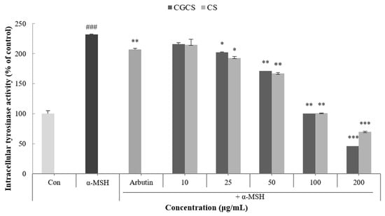 Tyrosinase is an enzyme that acts in the early stages of the melanin biosynthetic pathway and inhibits the activity of tyrosinase to prevent melanin synthesis []. Intracellular tyrosinase activity induced by α-MSH was measured after treatment with the CGCS extract, CS extract, and arbutin for 48 h. The CGCS extract decreased intracellular tyrosinase activity in a concentration-dependent manner. In addition, 200 µg/mL of the CGCS extract reduced tyrosinase activity by 23.6% compared to the CS extract and induced a higher tyrosinase inhibitory activity than the positive control, arbutin (Figure 4).