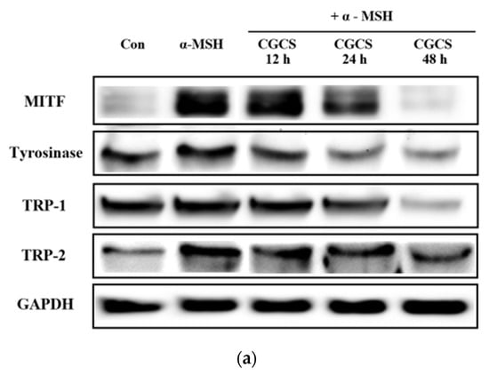 MITF is an important transcriptional regulator of melanin synthesis. MITF regulates tyrosinase and several factors, such as TRP-1 and TRP-2. The effect of the CGCS extract on the expression of transcription factors involved in melanin synthesis was determined by western blot. The CGCS extract was found to decrease the expression of MITF, tyrosinase, TRP-1, and TRP-2 induced by α-MSH at 12–48 h (Figure 5).