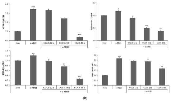 Effects of CGCS on the protein levels of melanogenic enzymes (Tyrosinase, TRP-1, TRP-2) and MITF. B16F10 mouse melanoma cells were treated with CGCS or α-MSH at the indicated concentration for 24 h. (a) MITF, Tyrosinase, TRP-1, and TRP-2 protein expressions were detected by western blotting. (b) Results were normalized against GAPDH expression. The data are presented as the mean ± SD of at least three independent experiments; # p < 0.05, ## p < 0.01, ### p < 0.001 compared with the control, ** p < 0.01, *** p < 0.001 compared with the α-MSH.