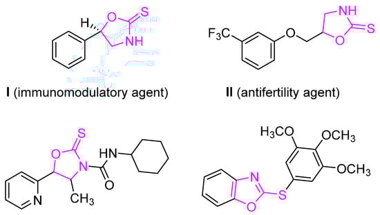 On the other hand, sulfur-containing compounds play an important role in organic synthesis and have been found in various natural products; they also appear in pharmaceuticals, agrochemicals, and functional materials [8,9]. Notably in asymmetric synthesis, a small heterocycle, 1,3-oxazolidine-2-thione (OZT), is a key molecule when chiral. Its parent heterocycle, 1,3-oxazolidine-2-one (OZO), is a chiral template that is well known in the Evans asymmetric methodology and that was specifically modified by Crimmins for the production of acylated OZT [10,11,12,13,14]. This small heterocycle is also well known as a degradation product from natural thioglucosides. The glucosinolates progoitrin, epiprogoitrin, and glucobarbarin are chiral OZTs resulting from the glucohydrolase action of a specific enzyme, myrosinase [15,16,17,18,19,20,21]. These molecules, as part of the defense mechanism of plants, have been shown to have several biological impacts—most notably on feedstock, but also on human health as inhibitors of tyrosine kinase [22,23]. They are also known for various biological activities such as anticancer, antibacterial, antifertility, and insecticidal activities [24]. A few representative biologically relevant OZT-based molecules are shown in Figure 1.