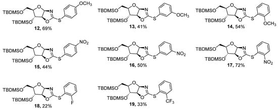 Although the exact mechanism remains unknown for this Cu-catalyzed S-arylation process, there are valuable experimental and theoretical mechanistic studies of Cu-catalysed N-arylation [59,60,61]. Moreover, there are investigations that the formation of the Cu(I)-complex nucleophile and the coupling product depends on the concentration of the ligand [62,63]. Applying optimized reaction conditions (Table 1, entry 7), the S-arylation reaction of 6 was explored with various functionalized aryl iodides (Scheme 5). The results are summarized in Table 2. Aryl iodides were chosen for their enhanced reactivity compared with other aryl halides. As shown in Table 2, D-arabinose derivative 6 reacted with various substituted aryl iodides, leading to the corresponding products 12–19 with low to good yields (Figure 2).