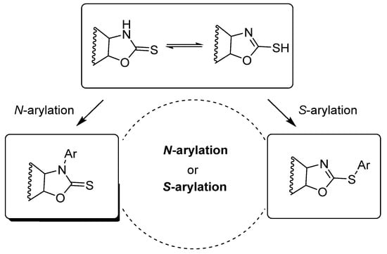 The oxazolidine-2-thione moiety has two potential nucleophilic sites: sulfur and nitrogen atoms. Accordingly, both S-arylation and N-arylation may take place due to the existence of two tautomeric thione–thiol forms (Scheme 1). Sulfur, as a soft nucleophile, can prevail in the formation of S-arylated products in a cross-coupling reaction [44,45,46].