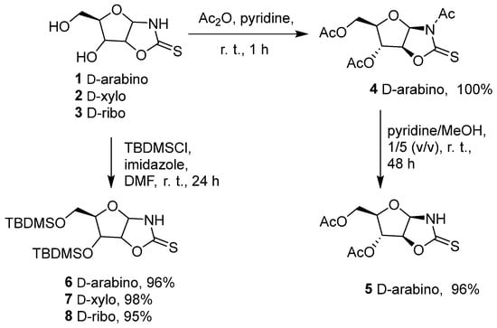 D-arabinofuranose-, D-xylofuranose-, and D-ribofuranose-derived oxazolidine-2-thiones 1–3 can easily be obtained from the corresponding carbohydrates using potassium thiocyanate under acidic conditions [2,36,47]. D-arabinose was chosen as the starting precursor in our study [48]. The protection of the hydroxyl groups was achieved with acetyl (Ac) or tert-butyldimethylsilyl (TBDMS) groups, allowing the selective protection of the alcohols obtained without modifying the oxazolidinethione group [47,49,50] (Scheme 2). The reaction of D-arabinose OZT 1 with acetic anhydride in pyridine resulted in the pre-acetylated product-derivative 4 in a quantitative yield without any requirement for purification. The crude product was selectively deacetylated in a mixture of methanol and pyridine. These conditions resulted in an efficient selective deacetylation of the acyl-protected 1,3-oxazolidine-2-thione vs. the ester group. The silylation process directly produced a selective protection of the hydroxyl groups of the three pentose OZTs 1, 2, and 3. The corresponding silyl- protected OZTs (6–8) were obtained in very good yields of 96%, 98%, and 95%, respectively.