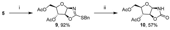 3.4. Synthesis of 2-benzylsulfanyl-4,5-dihydro(3′,5′-di-O-acetyl-1′,2′-dideoxy-β-D-arabinofuranoso)-[1,2-d]-oxazole (9)