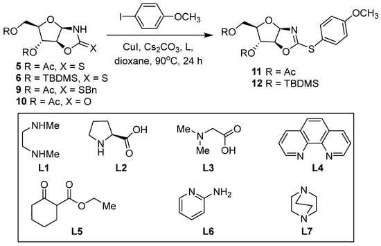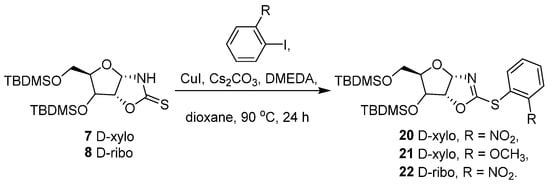 Copper-catalyzed coupling reactions was performed by applying standard conditions with various copper ligands and copper iodide, which was chosen for its air stability [51,52,53]. We first chose the D-arabino derivative 5 with 4-iodoanisole as a model substrate to optimize the catalytic S-arylation (Scheme 4, Table 1). As a control experiment (Table 1, entry 1), no product was observed if the reaction conditions were carried out in the absence of the copper ligand. When the reaction was performed with 20 mol% of CuI and 40 mol% of dimethylethylenediamine (DMEDA) under basic conditions (Cs2CO3), C-S coupling was observed with a better, but lower, yield of 20% (Table 1, entry 3). A reduced or increased ratio of CuI and DMEDA did not improve the yields. A reduction in the temperature to 60 °C maintained the results at 35% (Table 1, entry 5). Thus, the 1:2 ratio was maintained and proved to be similar to other copper-catalyzed cross-coupling reactions [54].