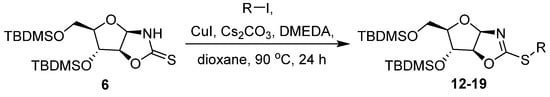 Herein, we present our preliminary results on the exploration of a chemoselective copper-catalyzed S-arylation reaction of aryl iodides with these unusual chiral oxazolidine-2-thiones anchored onto carbohydrate backbones. Copper-catalyzed S-arylation is a well-known process, but to our knowledge, it has not been applied to chiral OZT, or connected to carbohydrate backbones, in which the metal-catalyzed C-S bond formation has been scarcely explored [39,40,41]. Only a few examples have described the synthesis of S-arylated oxazolidinethiones, either through a one-pot procedure using isocyanide dichloride in a two-step approach [42] or using the reactivity of transient arynes with 2-oxazolidinethiones to obtain selective S-arylation [43].