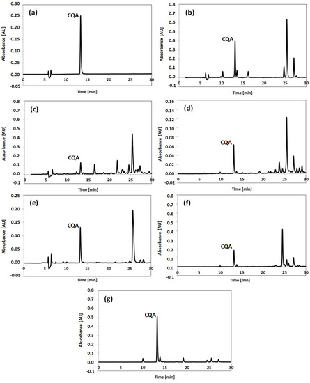 Exemplary chromatograms of the CQA extract after SSDM of the CQA standard (a) and water extracts obtained using the SSDM technique from pickled artichoke hearts (b), dried chamomile flowers (c), tansy (d), coltsfoot (e), yarrow (f) and green coffee beans (g).