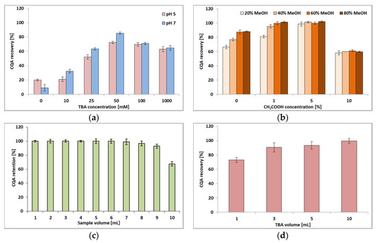 The data presented above were obtained under conditions such that the ion pairs between TBA+ and dissociated chlorogenic acid molecules were formed in the liquid phase. The ion pairs can be formed in a dynamic way on the sorbent surface as well. In this case, the sorbent surface becomes saturated with TBA ions sooner. To compare the effect of the ion-pair formation mode (in the liquid or solid phase) on the efficiency of CQA extraction, different volumes of TBA solution containing the same amount of TBA were passed through the previously conditioned C18 material. Then, 1 mL of the CQA solution adjusted to pH 7 was loaded onto the sorbent. Finally, CQA was eluted with 10 mL of a mixture of methanol in a 5% aqueous solution of acetic acid (20:80% v/v). The results are presented in Figure 2d and Table 1.