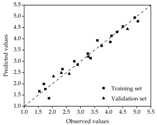 The log Koc values of 22 PFASs ranged from 1.54 to 5.04, the span range was 3.50, the average value (mean) was 3.22, and the corresponding standard deviation (SD) was 1.11. All data fell within the interval of (mean −3SD, mean +3SD) and did not require further processing [54]. In total, 80% of the data in the dataset were randomly selected as the training set (18 PFASs) for developing the QSPR model; the remaining 20% of the data were the test set (4 PFASs) for external validation of the model. Details about PFASs, experimental values and references pertaining to the modelling and external validation sets are given in Table S1 in the Supplementary Materials.