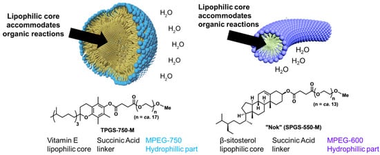 Schematics of self-assembled micelles from amphiphilic molecules for organic reactions. The designer amphiphilic surfactant TPGS-750-M self-assembles into spherical micelles dispersed in water. The hydrophobic core (composed of vitamin E) accommodates organic reactions using water as the bulk solvent. The designer amphiphilic surfactant “Nok” self-assembles into cylindrical structures (rod-like micelles) dispersed in water. The hydrophobic core (composed of β-sitosterol) accommodates reactions using water as the bulk solvent. Adapted with permission from [11,12].