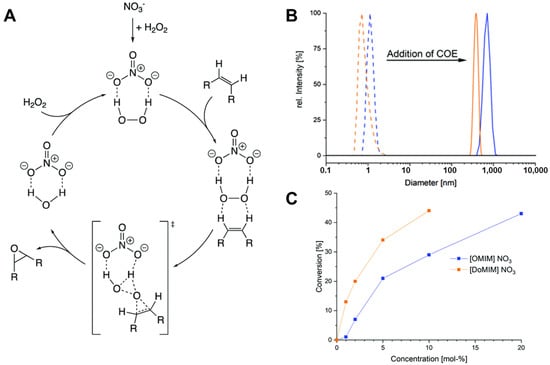 Surface-active imidazolium-based ionic liquids (IL) are known to form micelles in water and are capable of solubilizing cyclooctene to carry out metal-free epoxidation in water catalyzed by H2O2. (A) Proposed mechanism of the activation of H2O2 and olefin epoxidation by the nitrate anion. (B) Micelle size in 50 wt% H2O2 at 80 °C measured by dynamic light scattering. Blue: 357 mM [OMIM][NO3]. Orange: 357 mM [DoMIM][NO3]. Dashed line: IL solutions with ‘empty’ micelles; solid line: micellar solution after saturation with cyclooctene as model substrate. (C) Conversion of cyclooctene in the epoxidation with [OMIM][NO3] (blue) and [DoMIM][NO3] (orange). Product separation was achieved by decanting the supernatant phase. Adapted with permission from [53].