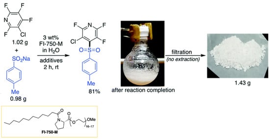 Handa and colleagues engineered FI-750-M, a proline-based designer surfactant (Figure 4) that mimics polar organic solvents, such as DMF and dioxane. In an aqueous environment, FI-750-M formed micelles with an inner lipophilic region, a proline linker, and a mPEG region at the interface with the aqueous solvent, with binding sites for polyfluoroarenes and sulfonate salts. Such binding was leveraged for sulfonylation of polyfluoroarenes under ambient conditions using water as the bulk solvent. As a model reaction, pentafluorobenzonitrile was reacted with sodium p-toluenesulfinate salt at room temperature (Table 3). The yield of the product in the presence of FI-750-M micelles was higher than that of other surfactants (TPGS-750-M, SDS, Tween 20, and Pluronic F-127). An additive (NaCl) was used to increase the product yield. This effect was attributed to enhanced exchange between dynamic micelles. The reaction between polyfluoroarenes and p-toluenesulfinate salt could be performed on a gram scale. The product precipitated from the aqueous dispersion and was recovered by filtration and washing (Figure 4). The resulting product could be polymerized, and the resulting polymers have potential applications as membranes for gas separation. The aqueous phase containing the micelles was reused in subsequent reactions [71].