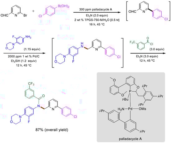 Versatile catalysts, such as palladacycles, have facilitated additional one-pot, three-step reactions. For example, reductive aminations have also been performed using Pd-based catalysts in TPGS-750-M micelles to produce pharmaceutical products, such as prozapine, cinacalcet, and fendiline, with ca. 90% yield. This capability could be combined to achieve tandem reactions in one pot. Specifically, Suzuki-Miyaura coupling was performed, followed by reductive amination and acylation (Figure 6). The product was recovered by extraction with ethyl acetate and purified by silica gel chromatography. An 87% yield of the desired product was achieved in three reaction steps. This class of catalyst also facilitated one-pot synthesis of celecoxib (a nonsteroidal anti-inflammatory agent) in a two-step method using Pd-based catalysts in TPGS-750-M micelles. Amination of bromosulfonamide was performed, followed by the addition of an unsymmetric β-diketone. The product was recovered by extraction with ethyl acetate and purified by column chromatography. The overall yield was 67% [114].