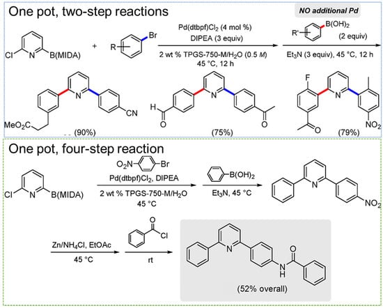 Building on these examples, longer sequences (e.g., 4 reaction steps) in one pot have been demonstrated. As a starting point, for Suzuki-Miyaura reactions, Pd(dtbpf)Cl2 was used in 2 wt% TPGS-750-M in water with DIPEA as the base. Typically, a 1:1 ratio of the two coupling partners is used at 45 °C. Following the coupling reaction, nickel-catalyzed hydrodehalogenation could be achieved by adding a nickel catalyst, ligand, base, and hydride source to the reaction. For example, 6-fluoro-2-B(MIDA)-pyridine could be coupled with an aryl bromide, followed by removal of the 6-halogen. Hydrodefluorination was achieved with 100% selectivity. The overall yield was 93%. As an alternative to dehalogenation, a second cross-coupling reaction was performed in one pot but without adding more palladium catalyst to the reaction vessel. By adding additional base and an arylboronic acid, a second coupling reaction was achieved to afford diarylated products, with overall yields of 75 to 90% (Figure 7). Building on these results, a four-step, one-pot reaction to produce a pharmaceutical analog to a hedgehog signaling antagonist was performed. Specifically, 6-chloro-2-B(MIDA)-pyridine was used as a starting material underwent two successive Suzuki-Miyaura cross-coupling reactions, followed (without intermediate isolation) by nitro-group reduction to the free amine by adding zinc and NH4Cl, with ethyl acetate as a cosolvent. For the fourth reaction, benzoyl chloride was added at room temperature to achieve the desired product. Following the reaction, additional ethyl acetate was added to extract the product. The resulting isolated yield was 52% following flash chromatography [125]. Similar reaction procedures were developed by Novartis [17].
