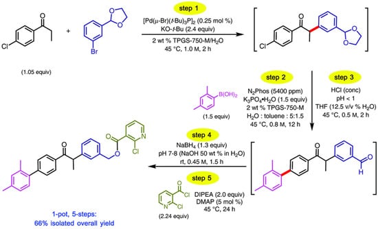 Further building in complexity, a five-step, one-pot reaction starting with α-arylation of 4′-chloropropiophenone with 1,3-dioxolane-containing aryl bromide was performed using Pd-based catalysts in TPGS-750-M micelles. Following isolation of the aryl chloride (66% isolated yield), Suzuki-Miyaura coupling was performed using a Pd catalyst with in situ ligand exchange. Without isolation of the intermediates, the aldehyde was generated, reduced to the benzylic alcohol, and treated with 2-chloronicotinonyl chloride to achieve the desired ester product (Figure 9). The product was isolated by extraction with ethyl acetate and further purified by flash chromatography, resulting in a 66% isolated yield [127].