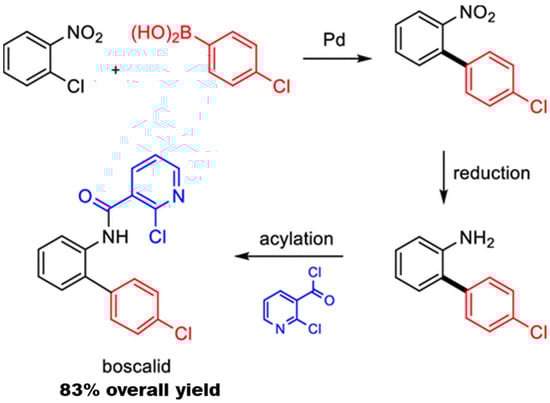 - Takale, B.S.; Thakore, R.R.; Mallarapu, R.; Gallou, F.; Lipshutz, B.H. A Sustainable 1-Pot, 3-Step Synthesis of Boscalid Using Part per Million Level Pd Catalysis in Water. Org. Process Res. Dev. 2020, 24, 101–105. [Google Scholar] [CrossRef]