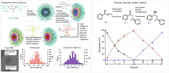Similar to small-molecule surfactant micelles, a hydrophobic polymer micelle core can enhance the solubility of organic compounds in water. The high local concentration in the core, for example, can enhance reaction rates. Additionally, the hydrophobic polymer core limits water, which increases the stability of substrates sensitive to hydrolysis. Because the polymeric nanoreactors are stable (compared to small-molecule micelles), the catalyst can be recovered following the reaction by precipitation or ultrafiltration methods. Through selection of the chemical moieties on the polymer, the selectivity can be modified based on non-covalent core-substrate interactions, e.g., hydrogen bonding [78]. Tools in polymer chemistry provide a platform to impart block copolymer micelles with unique properties, e.g., selective crosslinking to impart mechanical stability for reuse, stimuli-responsive components (e.g., pH and temperature), and the ability to incorporate a range of catalysts, such as organocatalysts, metal nanoparticles, and metal complexes [8,79].