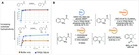 - Akporji, N.; Singhania, V.; Dussart-Gautheret, J.; Gallou, F.; Lipshutz, B.H. Nanomicelle-Enhanced, Asymmetric ERED-Catalyzed Reductions of Activated Olefins. Applications to 1-Pot Chemo- And Bio-Catalysis Sequences in Water. Chem. Commun. 2021, 57, 11847–11850. [Google Scholar] [CrossRef] [PubMed]