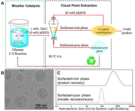 - Ge, X.; Song, W.; Chen, X.; Qian, C.; Zhou, S.; Liu, X. Tandem Micellar Catalysis and Cloud Point Extraction Process for C-S Coupling Reaction in Water. Colloids Surf. A Physicochem. Eng. Asp. 2021, 616, 126263. [Google Scholar] [CrossRef]