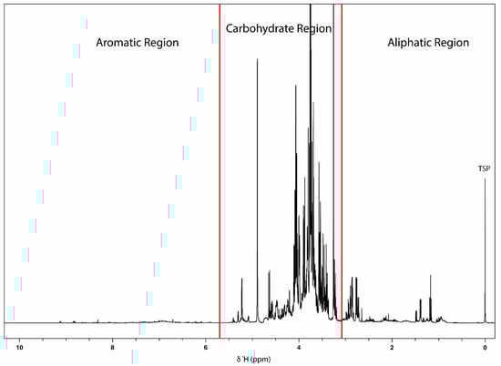 1H-NMR spectra were recorded using a 1D NOESY (noesygppr1d) pulse sequence. Acquisition parameters were: 64K data points, 8223 Hz (20 ppm) spectral width, 4 dummy and 16 scans, a recycle delay of 20 s, 14 µs for the hard pulse, 10 ms mixing time, and a fixed value for receiver gain for all samples. The water signal was suppressed by presaturation using continuous irradiation during relaxation delay. Spectra were locked and shimmed automatically using IconNMR. A line-broadening function of 0.3 Hz was applied automatically to all spectra for Fourier transformation with zero filling (X2). Finally, spectra were automatically phased, baseline corrected, and referenced to TSP at 0.0 ppm with TopSpin.