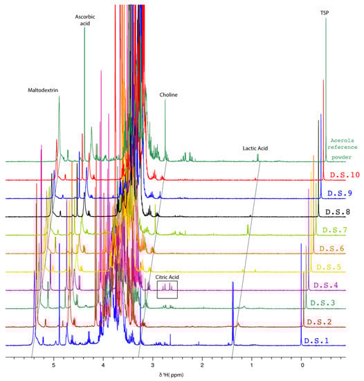 Furthermore, a broad and intense signal at 5.40 ppm was detected in the acerola reference powder and in all food supplement spectra except that of D.S.4. This signal corresponded to one signal of maltodextrin, the support used during the industrial process of drying the acerola concentrate to obtain the powder.