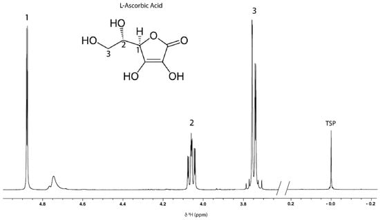 First, a 1D 1H-NMR spectrum of ascorbic acid (Tracert®, Sigma-Aldrich Chimie Merck—Saint-Quentin Fallavier, France) in D2O (Eurisotop, Gif sur Yvette, France) was recorded in order to assign the signals of its different protons (Figure 4). Peaks at around 4.88 ppm were assigned to H1 protons; those at 4.06 ppm to H2 protons; and those at around 3.74 to H3 protons of ascorbic acid. Because (OH) hydroxy protons interchange rapidly with deuterated water, they are not characterized by distinct resonances [41].
