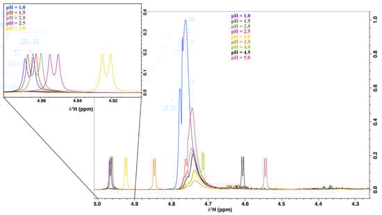 The pH optimization was performed with respect to the chemical shift of the H1 signal of ascorbic acid. Nine solutions of acerola reference powder with the pH adjusted to 1.0, 1.5, 2.0, 2.5, 3.0, 3.5, 4.0, 4.5, and 5.0 were prepared and used to record 1D 1H-NMR spectra. The chemical shift of the H1 proton decreased with an increasing pH (Figure 5), in agreement with published results about AA protonation equilibrium [42]. At a pH of 1 to 3, the H1 resonance signals overlapped with the maltodextrin signal at 4.94–4.98 ppm. At pH 4, the H1 resonance signals were at about 4.71 ppm, but the presaturation pulse sequence used to suppress the water signal caused distortion in this region, which may have impacted quantification. At a pH above 4, the H1 signals overlapped with the sugar signals. Therefore, at the higher pH values, the H1 signal could be used to quantify ascorbic acid. The best position of the peak, allowing it to be isolated and quantifiable, was at 4.92 ppm, which was obtained at pH 3.5. After a fine adjustment, the pH value retained was 3.35.