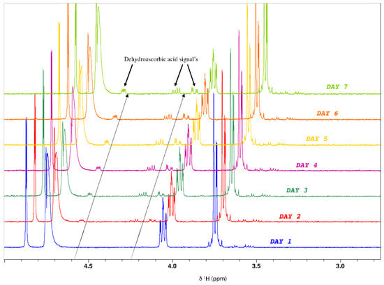 Figure 7 shows the superposition of the spectra obtained for tube 1, which had the lowest AA concentration. From day 2, the signals of dehydroascorbic acid (DHA) were detected and their intensity increased as a function of time. DHA is an oxidized form of ascorbic acid [50]. Its quantity increased as a function of time. Thus, the variations observed in the AA concentration (Table 6) were explained by its oxidation and transformation into DHA.