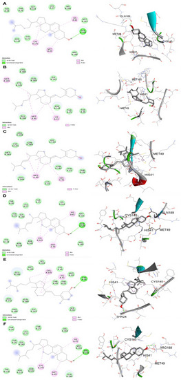 Molecular docking 2D and 3D interaction representation between SARS-2 Mpro and (A) 7-dehydrocholesterol, (B) cholecalciferol, (C) ergocalciferol, (D) ergosterol, (E) 22,23-dihydroergocalciferol, and (F) 22,23-dihydroergosterol.