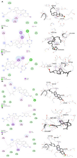 Molecular docking 2D and 3D interaction representation between SARS-2 PLpro and (A) 7-dehydrocholesterol, (B) cholecalciferol, (C) ergocalciferol, (D) ergosterol, (E) 22,23-dihydroergocalciferol, and (F) 22,23-dihydroergosterol.