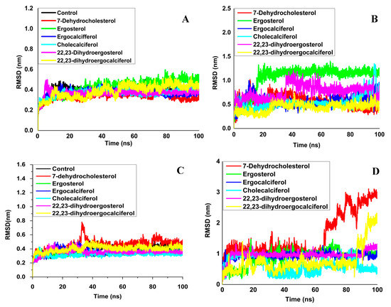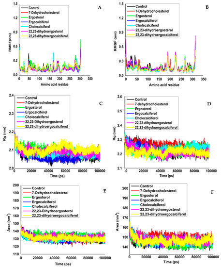 Unlike Mpro and PLpro, the inhibitors possessed a substantial RMS deviation (Table 2). For Mpro, the highest RMSD of 1.062 nm was demonstrated by ergosterol, whereas 7-dehydrocholesterol showed the highest RMSD of 1.537 nm for PLpro, indicating the flexibility of ligand binding in the active sites of Mpro and PLpro. Kumar et al. (2021) [46] and Motiwale et al. (2020) [47] documented a similar pattern of RMSD analysis for phytochemical inhibitors against SARS Mpro.