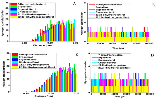 Hydrogen bonds are essential in determining the interaction strength among enzymes and ligands. The temporal dependence of intermolecular hydrogen bonding between receptor and drug-like entities was investigated during the simulation period to predict the binding of pre- and pro-vitamin D molecules in the active site (MPro and PLPro). During the 100 ns simulation run, the ligand–protein made multiple hydrogen bonds, according to the hydrogen bond analysis. The hydrogen bonds were scattered at 0.25–0.35 nm, according to the hydrogen bond pattern depicted in Figure 5.