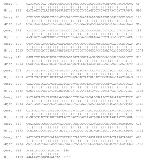 A molecular genetic method for genotyping—sequencing of the 16S rRNA gene was used to confirm the species identification of Lactobacillus 2/20. The results of the 16S rDNA sequencing analysis referred Lactobacillus 2/20 to the species Lactobacillus helveticus with 99% similarity between the 16S rDNA sequence of Lactobacillus 2/20 and the partial 16S rDNA sequence of Lactobacillus helveticus DSM 20075 (Figure 1).
