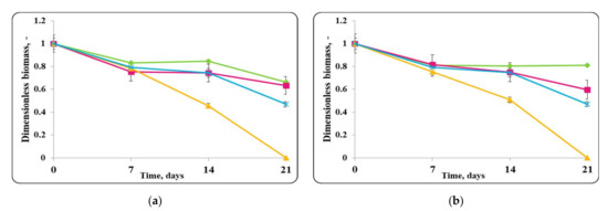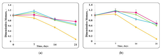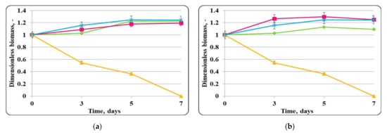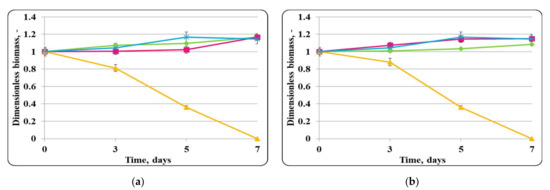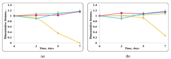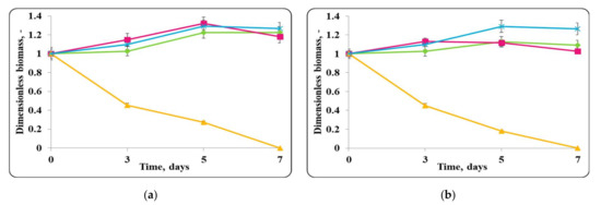 (a) free lactobacilli cells; (b) encapsulated lactobacilli cells. Changes in the dimensionless biomass of Lb. helveticus 2/20 and S. aureus ATCC 25923 in MRS broth at 20 ± 2 °C. Legend: Green ◆: Lb. helveticus 2/20 population following its inoculation; Pink ■: Lb. helveticus 2/20 population following its co-inoculation with S. aureus ATCC 25923; Blue ×: S. aureus ATCC 25923 population following its direct inoculation; Yellow ▲: S. aureus ATCC 25923 population following its co-inoculation with Lb. helveticus 2/20.